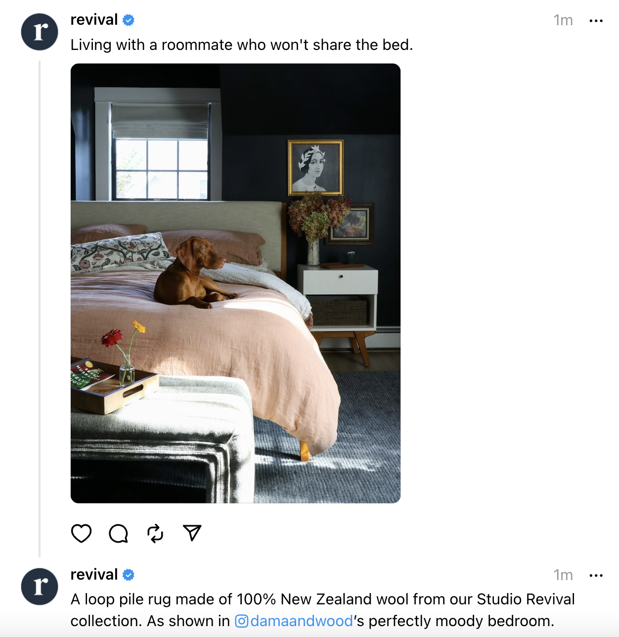 I worked as a Copywriter and Creative Strategist for Revival Rugs: multi-channel copywriting (email, social, paid, web, video), social strategies for Threads + Pinterest, IG stories + IG reels & copy execution, paid social campaigns, content performance analysis, copy-editing, product copy, collection naming, creative direction, email marketing, About + FAQ page copy, blog writing. Select work ahead. Revival